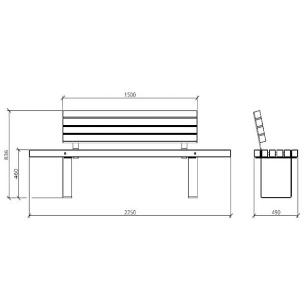 Dimension : L x l x H : 2250 x 490 x 836 mm. Hauteur d’assise 460 mm. Poids 75 kg.