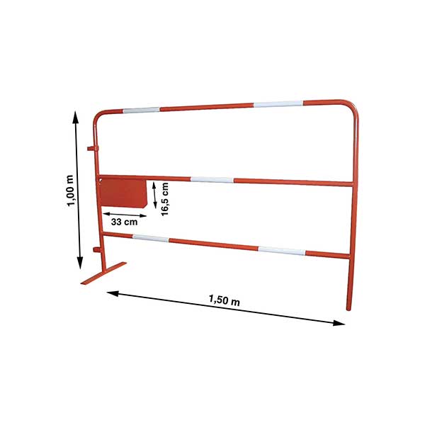 En tube d’acier Ø 25 mm. Revêtement époxy rouge + 5 adhésifs blancs. Plaque soudée : 33 x 16.5 cm.