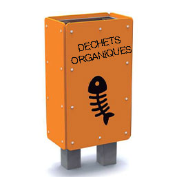 Au choix : verre (vert), papier (bleu), déchets dangereux (rouge), emballages (jaune), déchets organiques (marron) ou