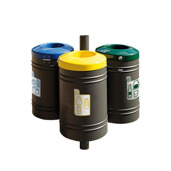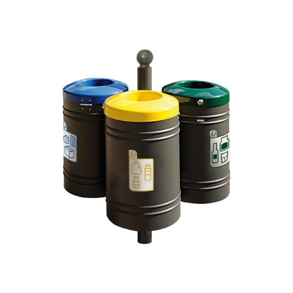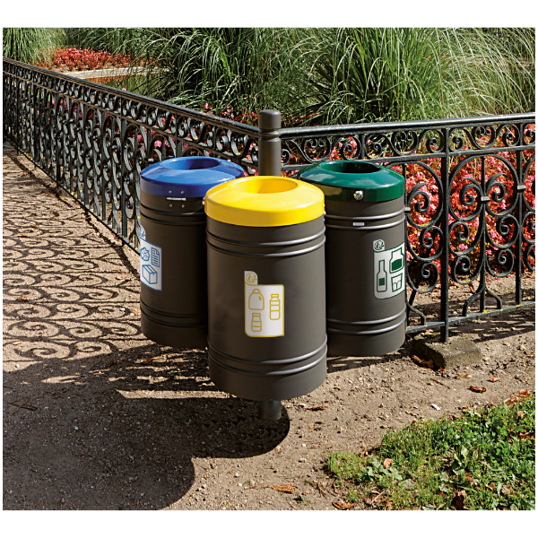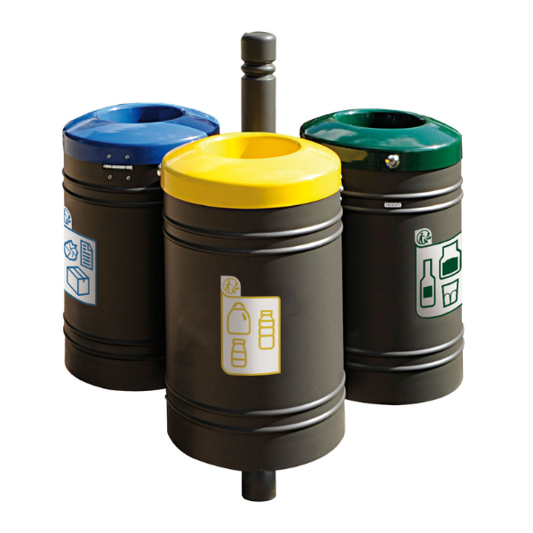 Ensemble de tri sélectif prêt à l’emploi, il ne vous reste qu’à choisir la finition du poteau central et le coloris des corbeilles !